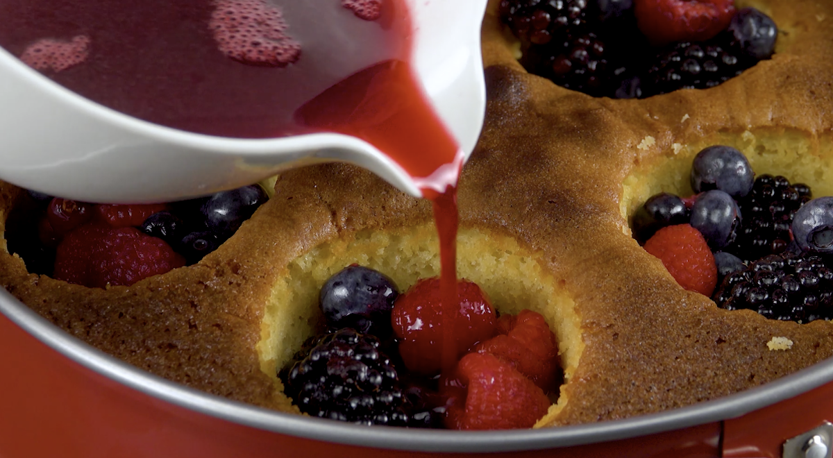7.) Wenn der Kuchen etwas abgekühlt ist, gib die Beeren (ohne Gläser) wieder in die Löcher und gieße den Wackelpudding darüber. Stelle den Kuchen etwa 1 Stunde kalt.