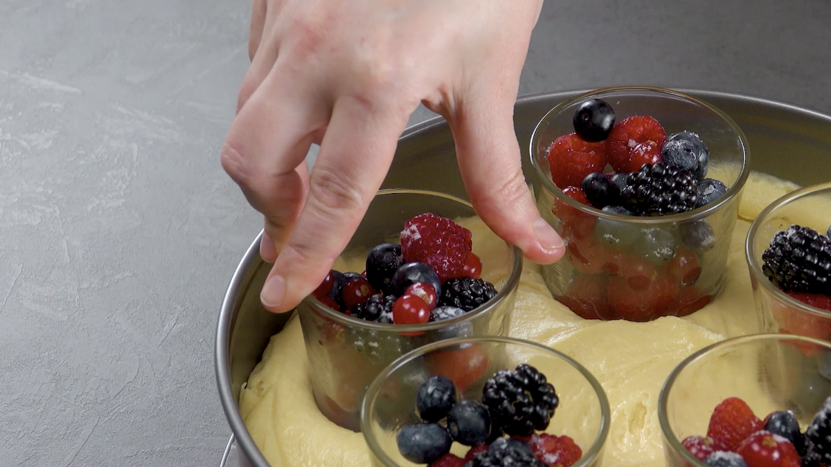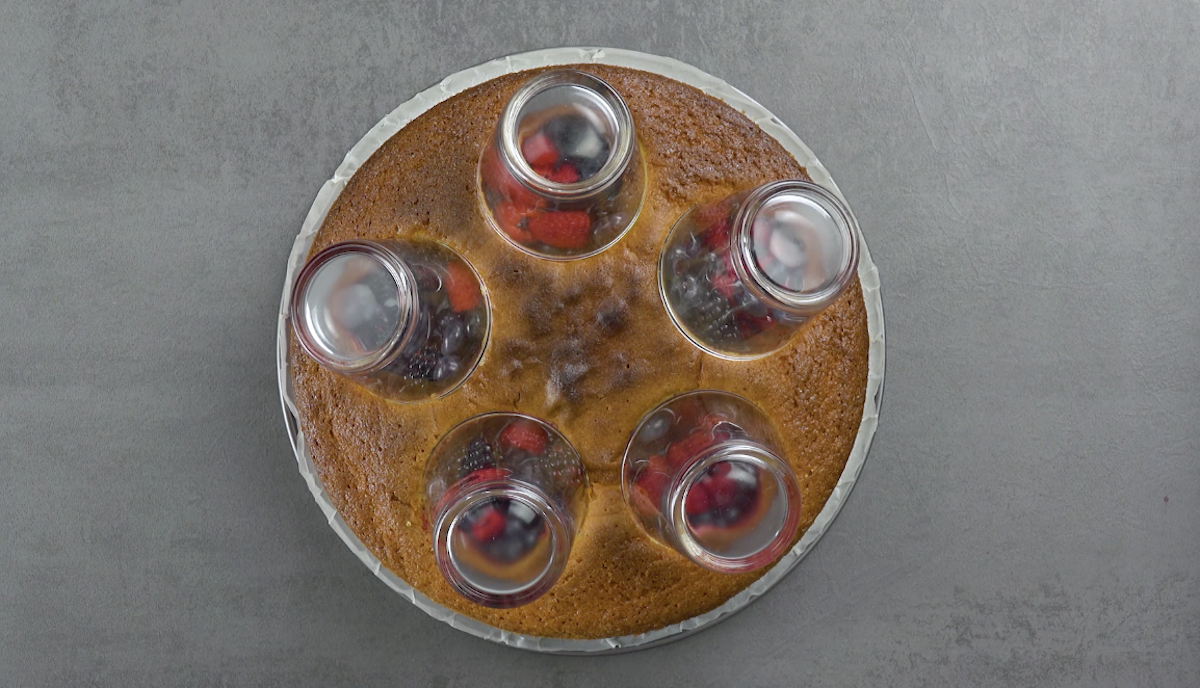 5.) Stelle die gefüllten Gläser in kreisförmiger Anordnung in den Teig in der Kuchenform und backe den Kuchen für 60 Minuten bei 175 °C Umluft.