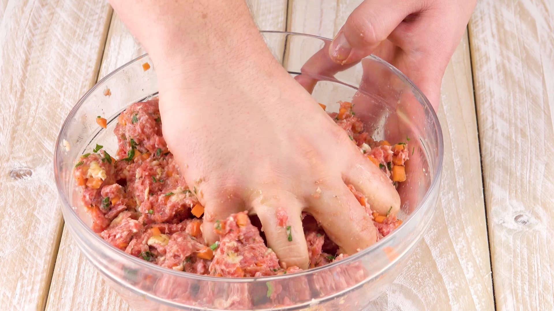 1.) Vermenge das Rinderhackfleisch mit den gewürfelten Karotten, den beiden Eiern, der Petersilie, dem Knoblauch, Salz und Pfeffer sowie dem Brötchen, das du zuvor zerteilt und in der Milch aufgeweicht hast.