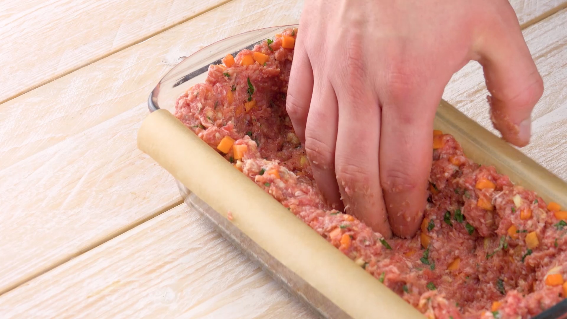 2.) Kleide mit dieser Hackfleischmasse Boden und Wände einer Auflaufform aus und gare sie für 10 Minuten bei 180 °C Umluft im Ofen.
