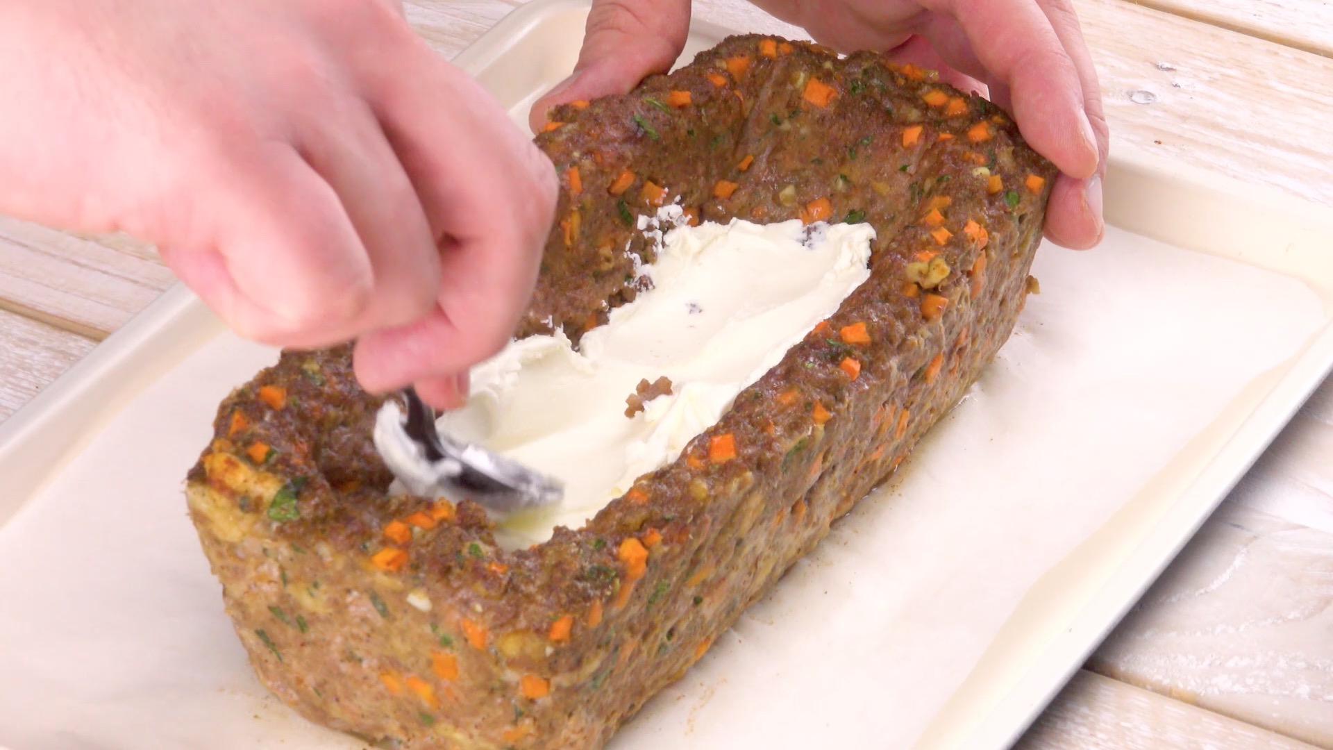 3.) Brate den Speck und schichte abwechselnd Frischkäse und 10 der Baconstreifen in der Kuhle des Hackbratens aufeinander.