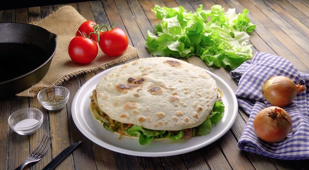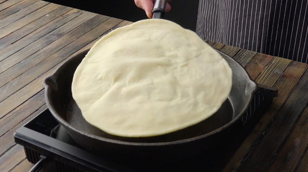 1.) Für den Teig vermengst du Mehl, Wasser und Salz und knetest alles ca. 5 Minuten gut durch. Halbiere den Teig-Kloß und forme daraus 2 Kugeln. Rolle beide Kugeln mithilfe eines Nudelholzes ca. 2 bis 3 Millimeter dick aus, sodass du zwei gleich große Teig-Teller vor dir hast. Röste beide nacheinander von beiden Seiten langsam in einer trockenen Pfanne.