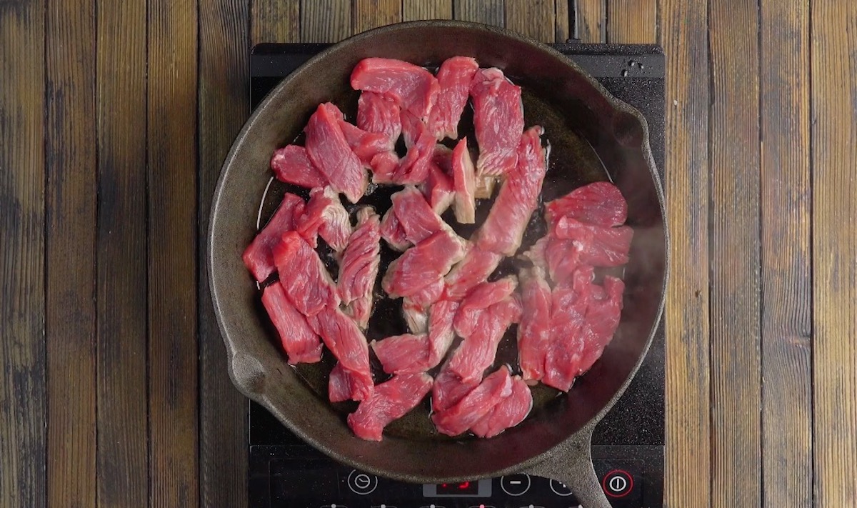 4.) Lass eine Pfanne erneut heiß werden und gib etwas Öl hinein. Füge die Rumpsteakstreifen hinzu, brate sie scharf an und würze sie mit Salz und Pfeffer.