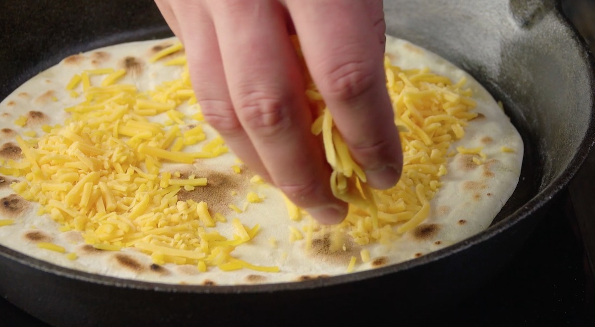 2.) Wenn das zweite Fladenbrot beidseitig gut angeröstet ist, gibst du noch in der Pfanne den geriebenen Cheddar-Käse obendrauf, der dann auf dem Fladen schmilzt. Stelle die Pfanne danach kurz beiseite.