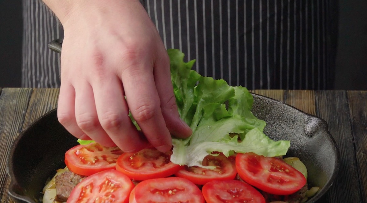 5.) Gib die angebratenen Fleischstücke in die Pfanne zu dem Fladenbrot mit Cheddar-Käse und Zwiebeln. Lege noch ein paar Tomatenscheiben und 3 bis 4 Salatblätter obendrauf.