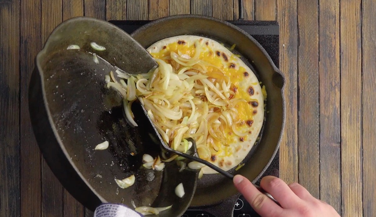 3.) Brate nun in einer anderen Pfanne die geschnittenen Zwiebeln in Olivenöl scharf an und würze sie mit Salz und Zucker. Wenn die Zwiebeln die gewünschte Bräune erreicht haben, gib sie auf das Fladenbrot mit dem Cheddar-Käse.