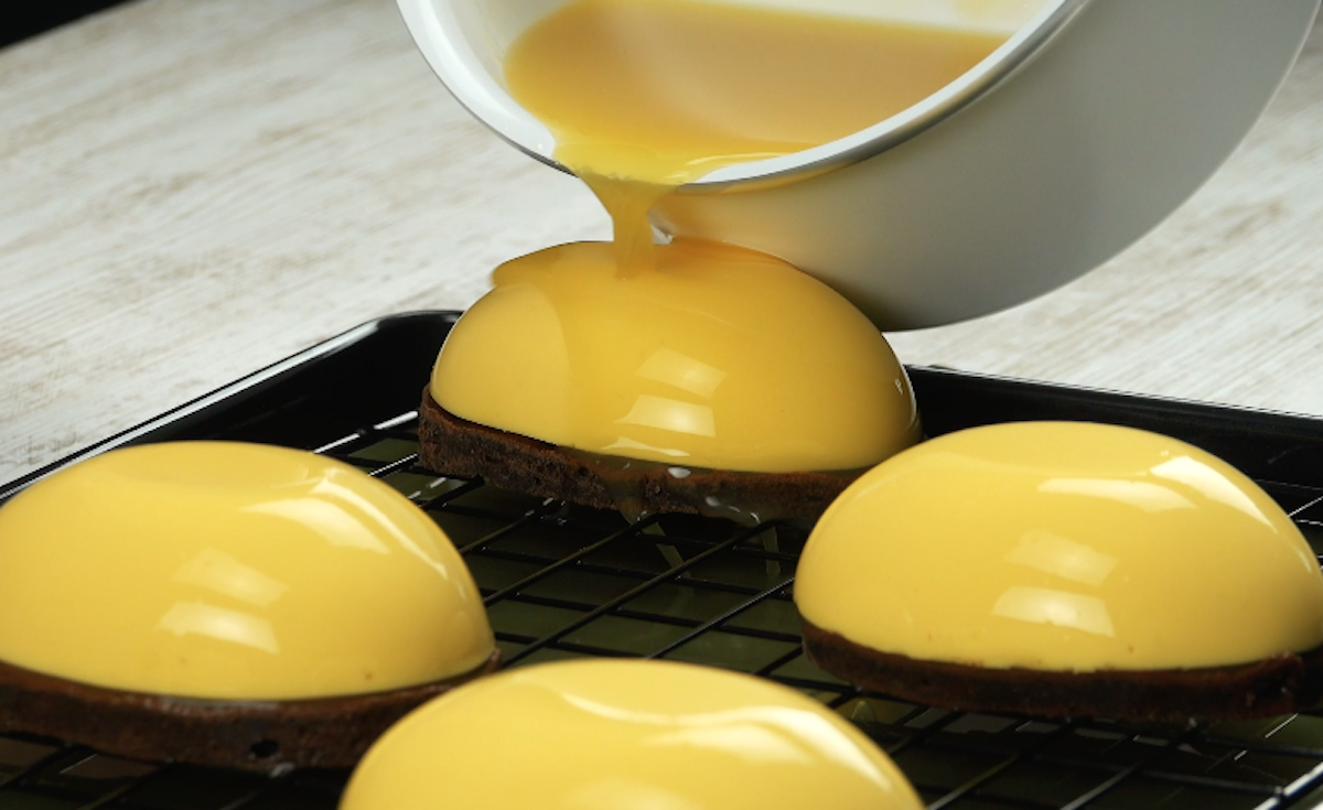 5. Erwärme Orangensaft mit Honig und füge zuvor eingeweichte Gelatine hinzu. Lasse das Gelee auf ca. 20 °C abkühlen, gieße es dann über die Frischkäse-Eier und stelle nochmal alles für mindestens 1 Stunde kalt. Lege die fast fertigen Bienchenkuchen am besten auf einen Rost, damit du das flüssige Gelee ohne Probleme über sie gießen kannst.