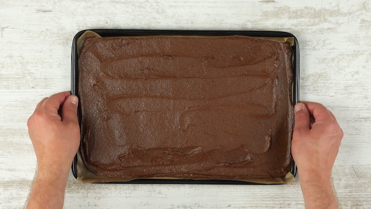 2. Gib geschmolzene Zartbitterschokolade und Öl in eine Schüssel und vermenge alles gut mit einem Schneebesen. Füge Kakaopulver, Zucker, Salz und Milch hinzu und verrühre alles nochmals gut miteinander. Schlage dann die Eier nacheinander hinein und gib das Mehl und das Vanillearoma hinzu. Verrühre alles zu einem Teig. Verteile diesen nun auf dem Backblech und streiche alles gleichmäßig glatt. Backe den Teig ca. 10 bis 12 Minuten und lasse ihn danach abkühlen.