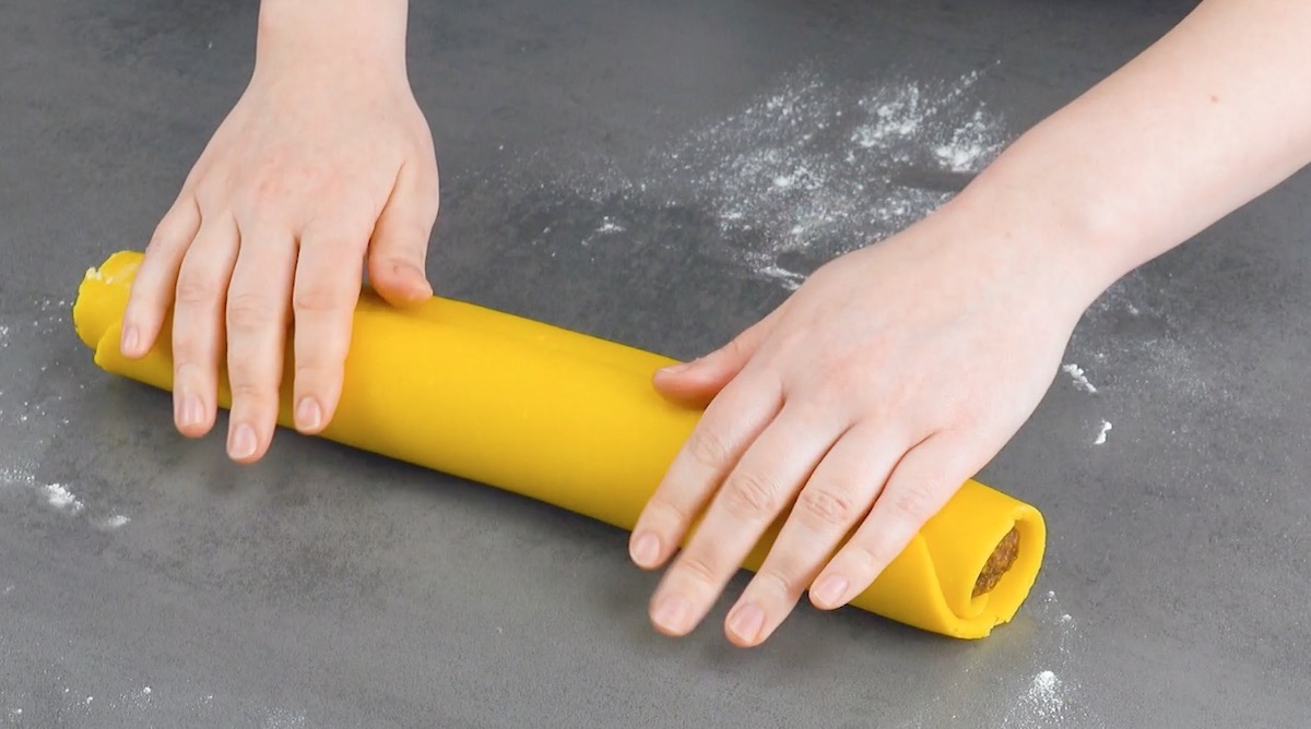 4. Schneide die Teigrolle in gleich große, leicht schräge Stücke.