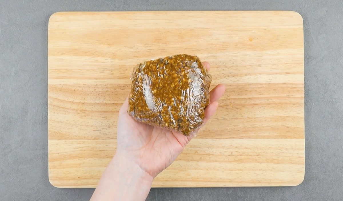1. Zerkleinere die Mandeln oder verwende gleich gemahlene Mandeln. Rühre dann braunen Zucker, Eiweiß sowie Honig unter. Schlage die süße Mischung in Frischhaltefolie ein und lege sie für 15 Minuten in den Tiefkühler.