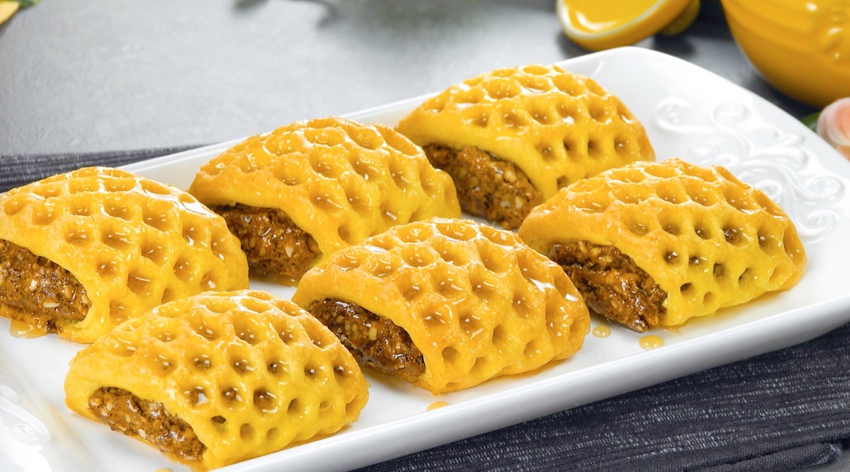 Die mit Mandeln und Honig gefüllten Bienenwaben sehen viel aufwendiger aus, als sie sind. Zudem haben die hübschen Teigteilchen durchaus Potenzial, die Hauptattraktion auf jedem Kuchenbuffet zu werden.