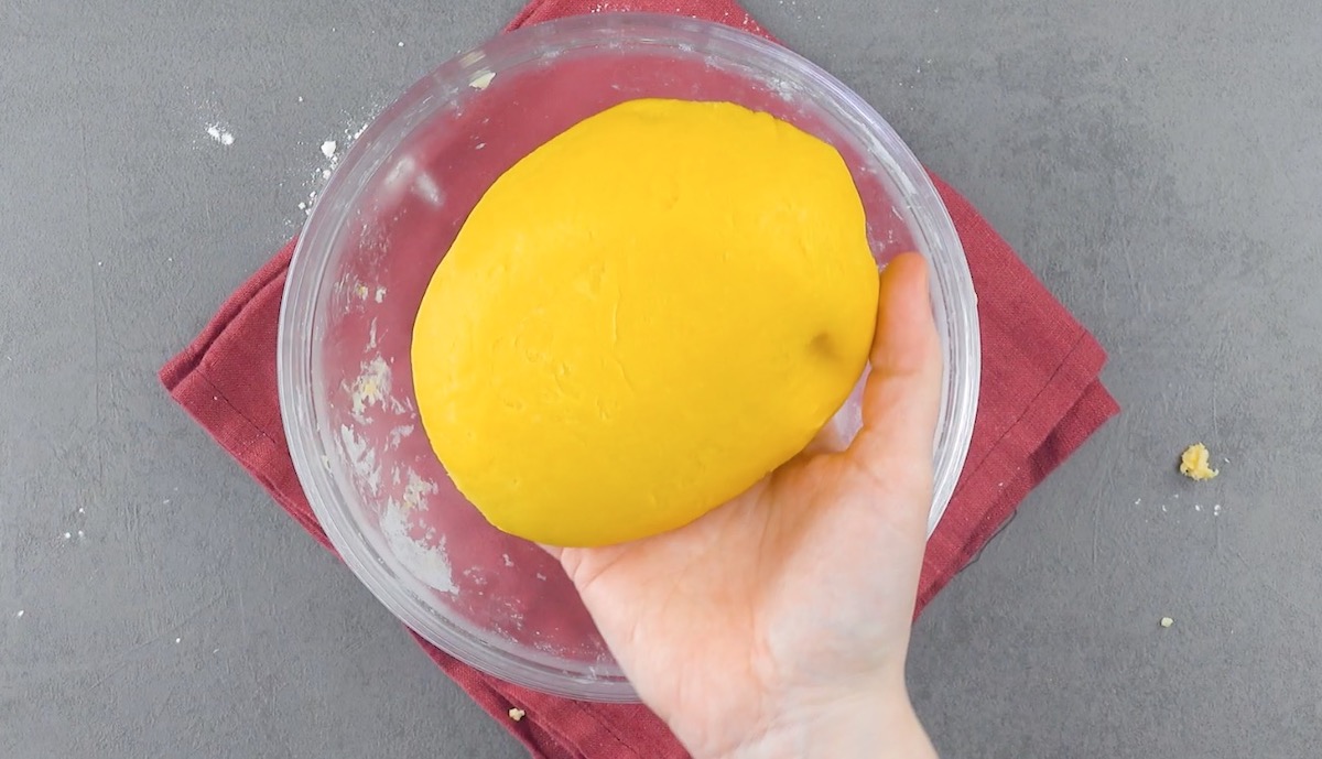 2. Verknete währenddessen für den Teig zunächst Mehl, Stärke, Backpulver, Salz und Butter miteinander. Löse dann die Safranfäden in 100 ml Wasser auf, siebe Reste gegebenenfalls heraus, und mische das Safranwasser mit in den Teig. Lege den Teig anschließend für 10 Minuten in den Kühlschrank.
