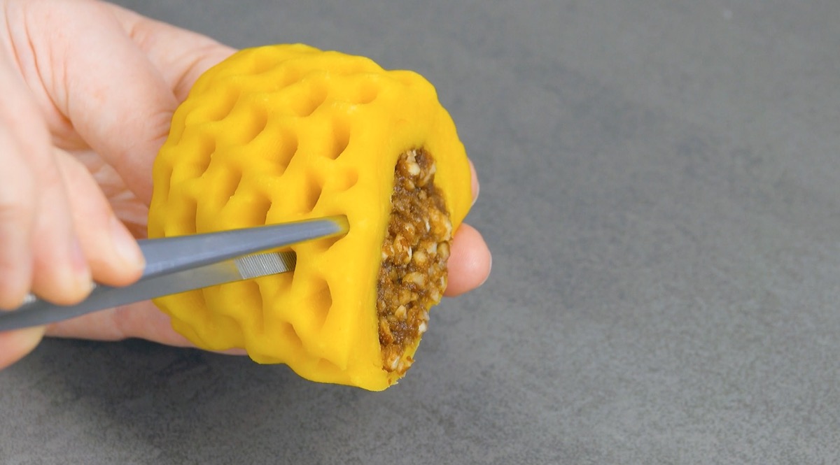 In diesem Rezept verwenden wir für den Bienenwaben-Look jedoch einfach eine Pinzette; zudem werden die Bienenwaben mit einer süßen Mischung aus Mandeln und Honig gefüllt.