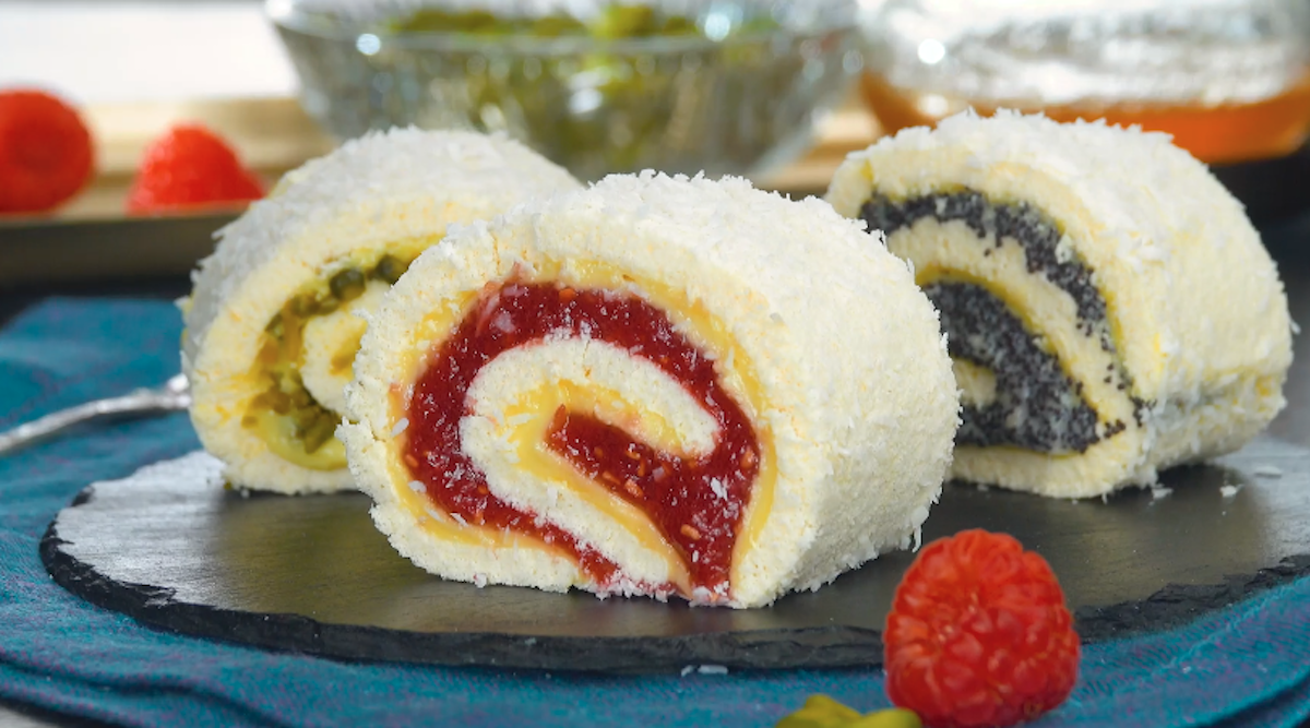 Biskuitteig ist die Basis für viele Torten- und Kuchen-Klassiker. Wie zum Beispiel für die Biskuitrolle. Oft wird die Biskuitrolle mit einer Erdbeer- oder Vanillecreme zubereitet. Sogar im Tiefkühlfach liegen verschiedene Geschmacksrichtungen bereit. Aber folgende Biskuitrolle hast du so bestimmt noch nie gesehen. Unsere Biskuitrolle ist mit Kokosraspeln ummantelt und überzeugt mit 4 verschiedenen Füllungen. Vanillepudding trifft auf Himbeermus, Mohncreme und gehackte Pistazien.