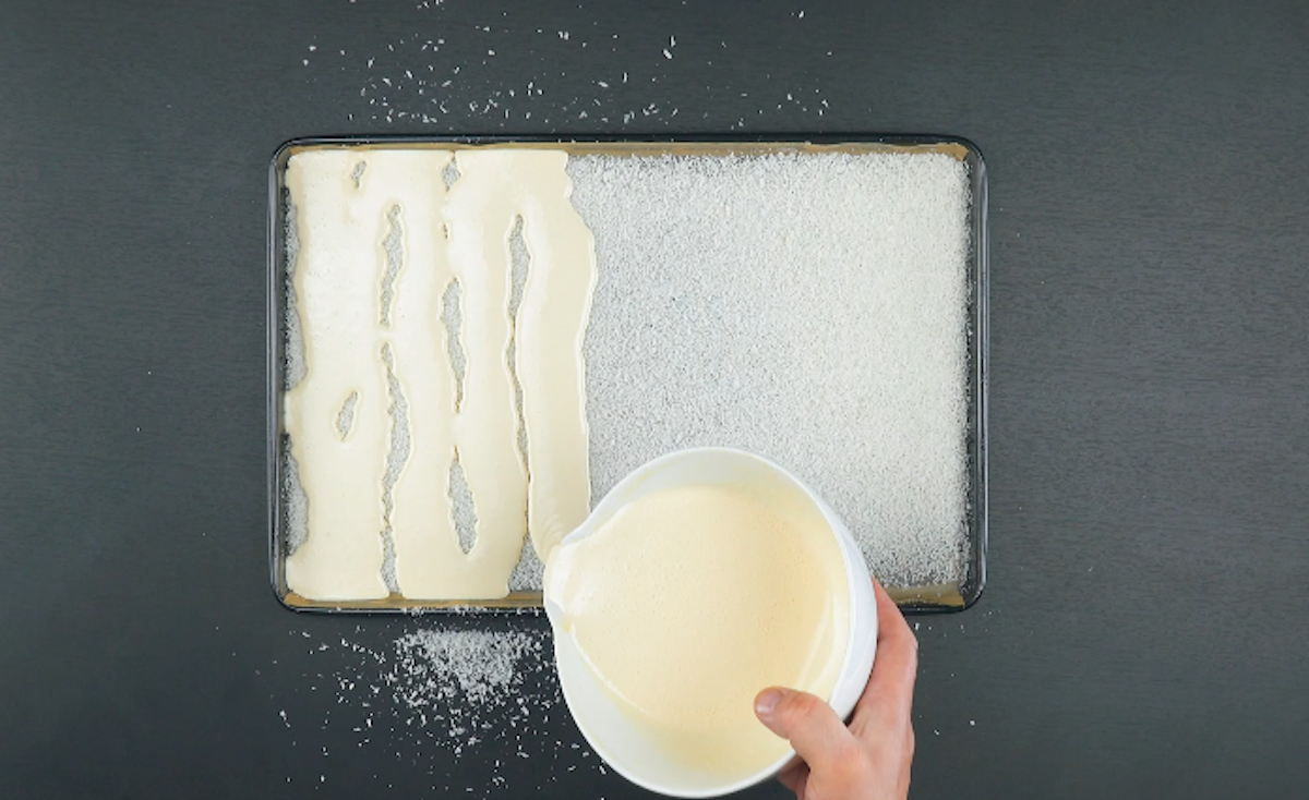 5. Lege ein Backblech mit Backpapier aus und verteile die Kokosraspel gleichmäßig darauf. Gieße dann vorsichtig den flüssigen Teig auf die Kokosraspel. Schiebe das Blech bei 170 °C Umluft für 12 Minuten in den vorgeheizten Ofen (obere Schiene). Nach dem Backen lässt du den Teig kurz abkühlen.