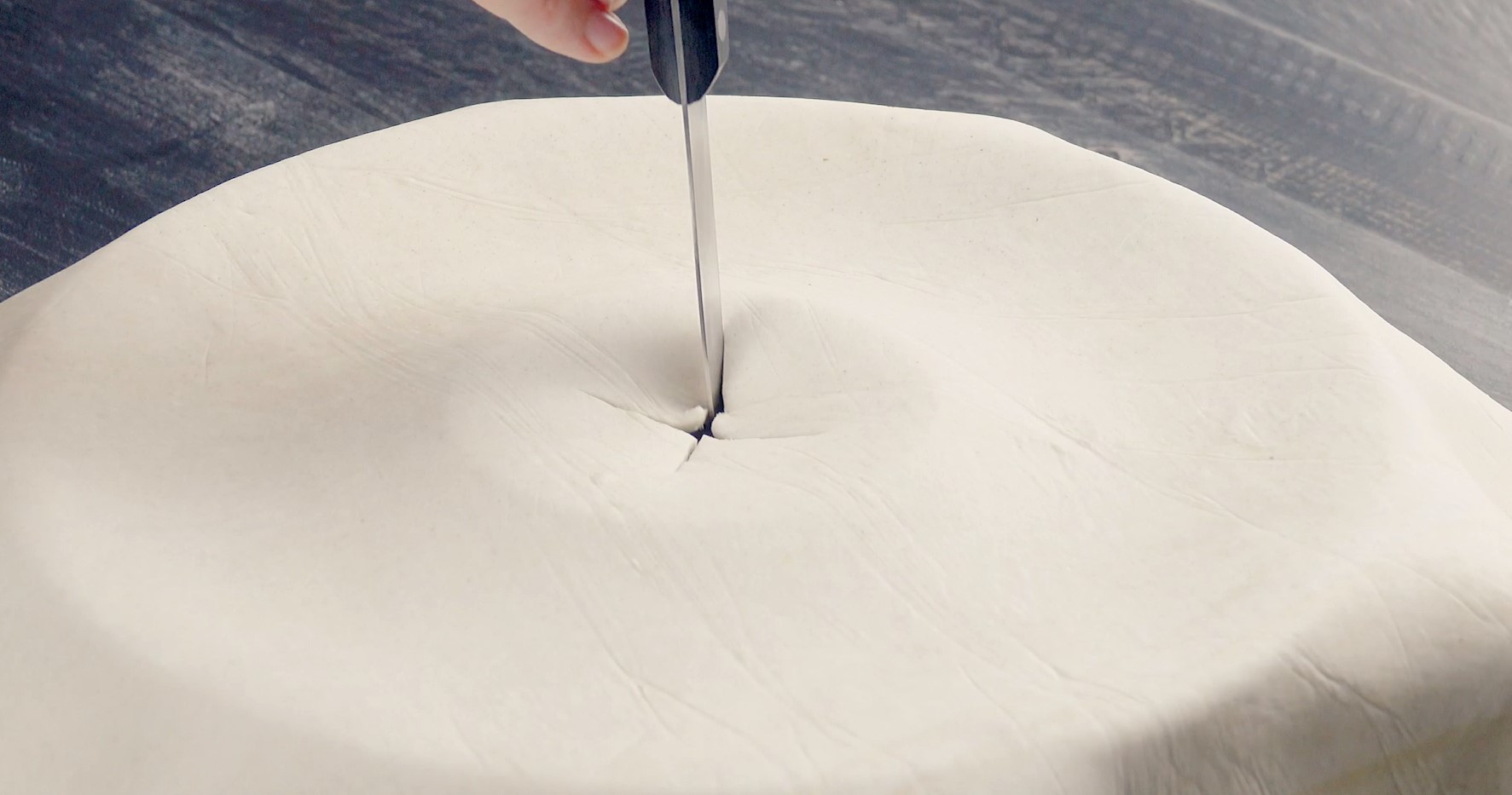 1.) Lege die Blätterteigplatte auf eine Gugelhupfform. Schneide dann in der Mitte ein Kreuz hinein und drücke den Teig anschließend innen leicht an die Form, bis sie ganz damit ausgekleidet ist.