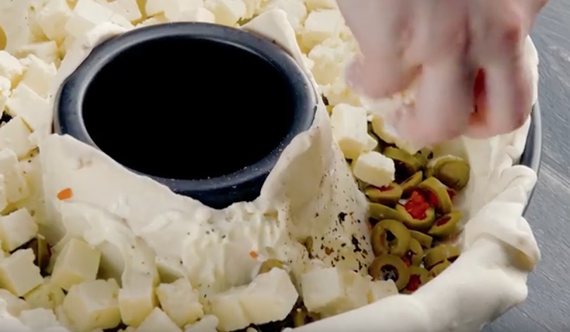 2.) Anschließend kommen die Zutaten in die Form. Dafür streichst du zuerst die Crème fraîche auf den Teig und würzt diese Schicht mit Pfeffer. Streue dann nacheinander die grünen Oliven, den Feta, die Paprika, die schwarzen Oliven und zuletzt den geriebenen Käse in die Form.