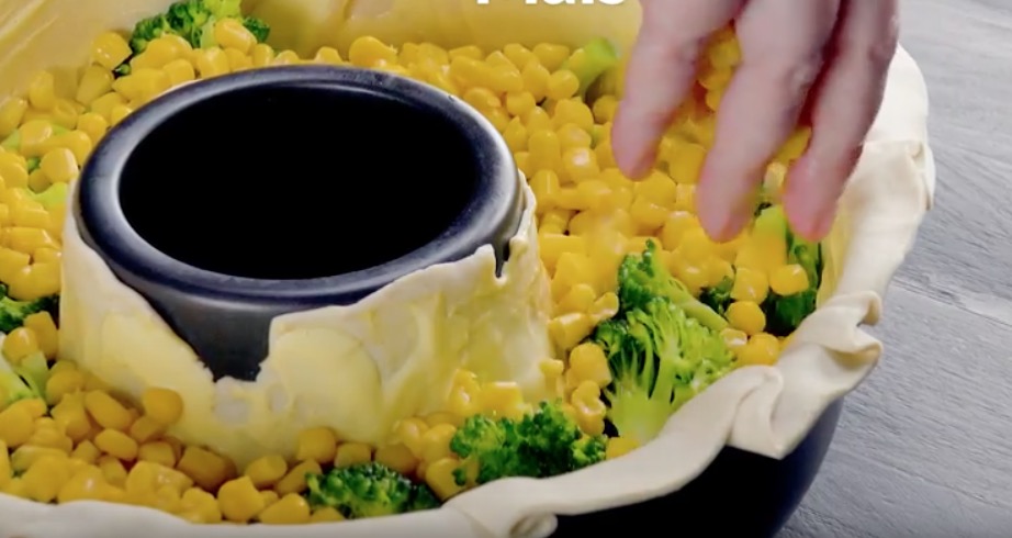 2.) Anschließend kommen die Zutaten in die Form. Dafür streichst du zuerst die Sauce hollandaise auf den Teig. Verteile nun gleichmäßig den Brokkoli und den Mais in der Form und streue den Lauch und den Käse darüber.