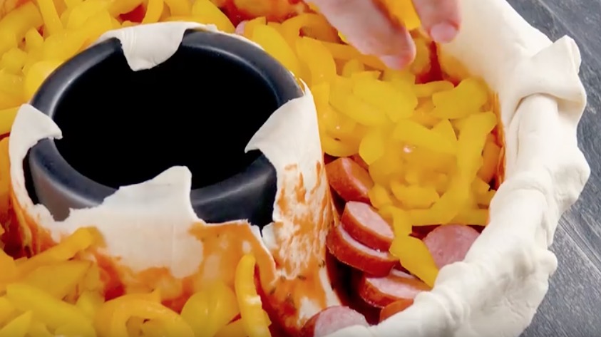 2.) Anschließend kommen die Zutaten in die Form. Dafür streichst du zuerst die Tomatensoße auf den Teig. Verteile nun gleichmäßig die Kabanossi, die Paprika und die getrockneten Tomaten in der Form.