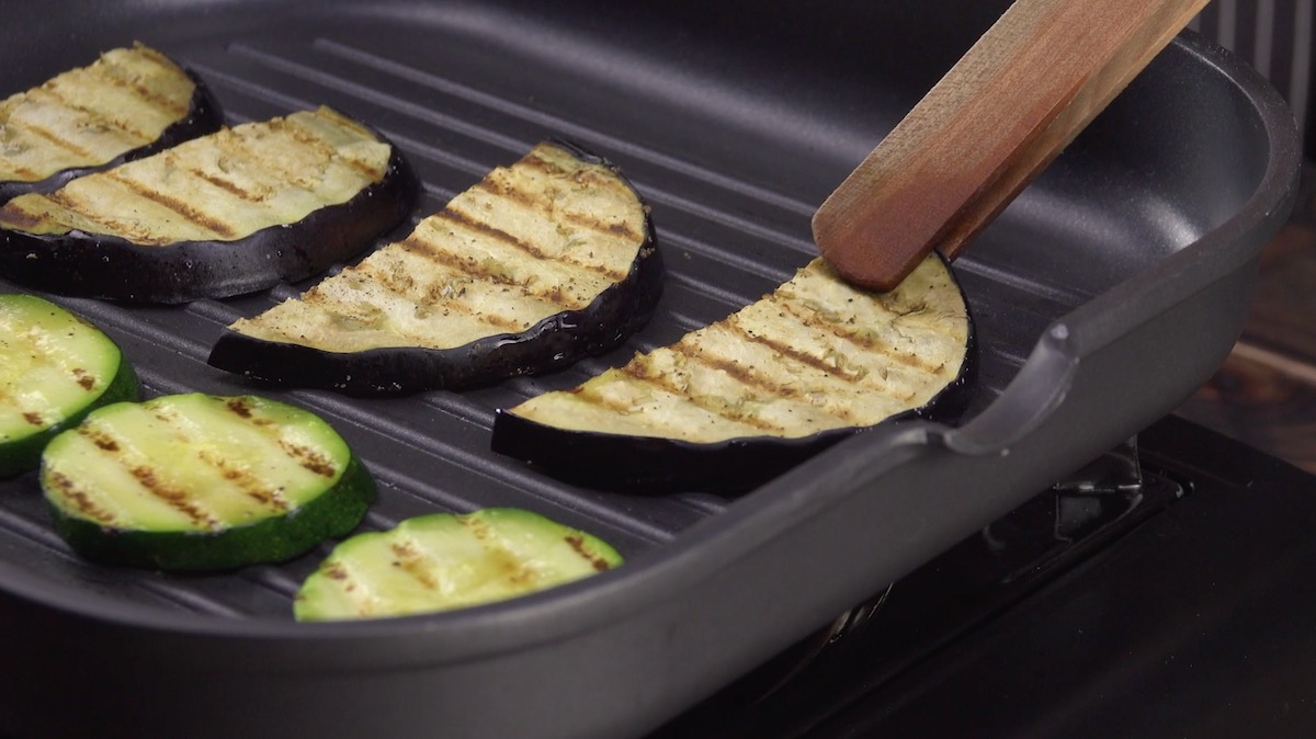 2.) Brate die Zucchini- und Auberginenscheiben von beiden Seiten gut an.