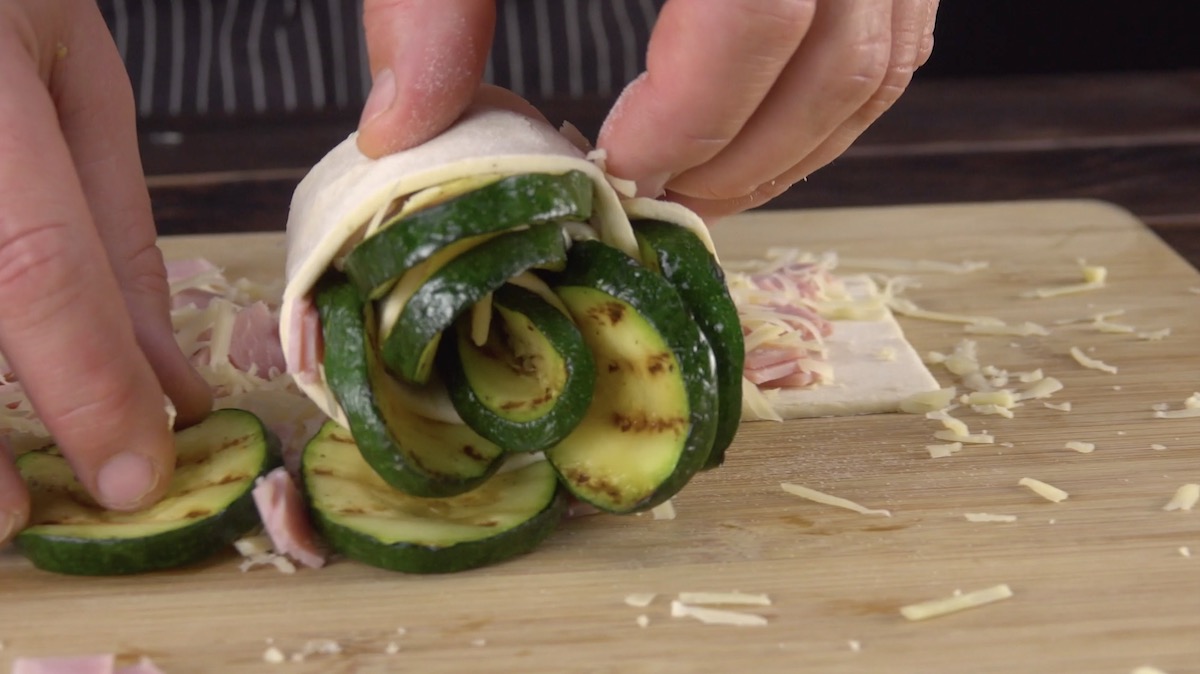 5.) Platziere nun Zucchinischeiben auf einem der Blätterteigstreifen und rolle den Teig der Länge nach ein, sodass sich eine kleine Blüte formt.