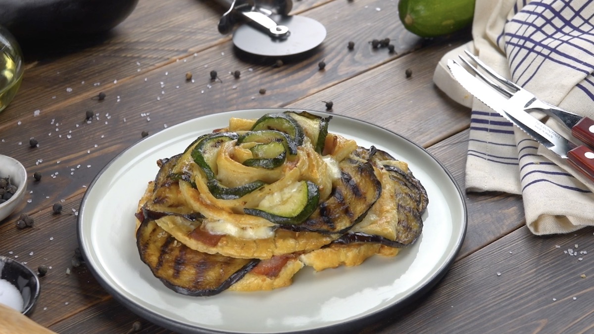 7.) Auf die letzten beiden Teigstreifen legst du nun Auberginenscheiben und wiederholst das Einrollen, bis du eine gigantische Blüte in den Händen hältst.