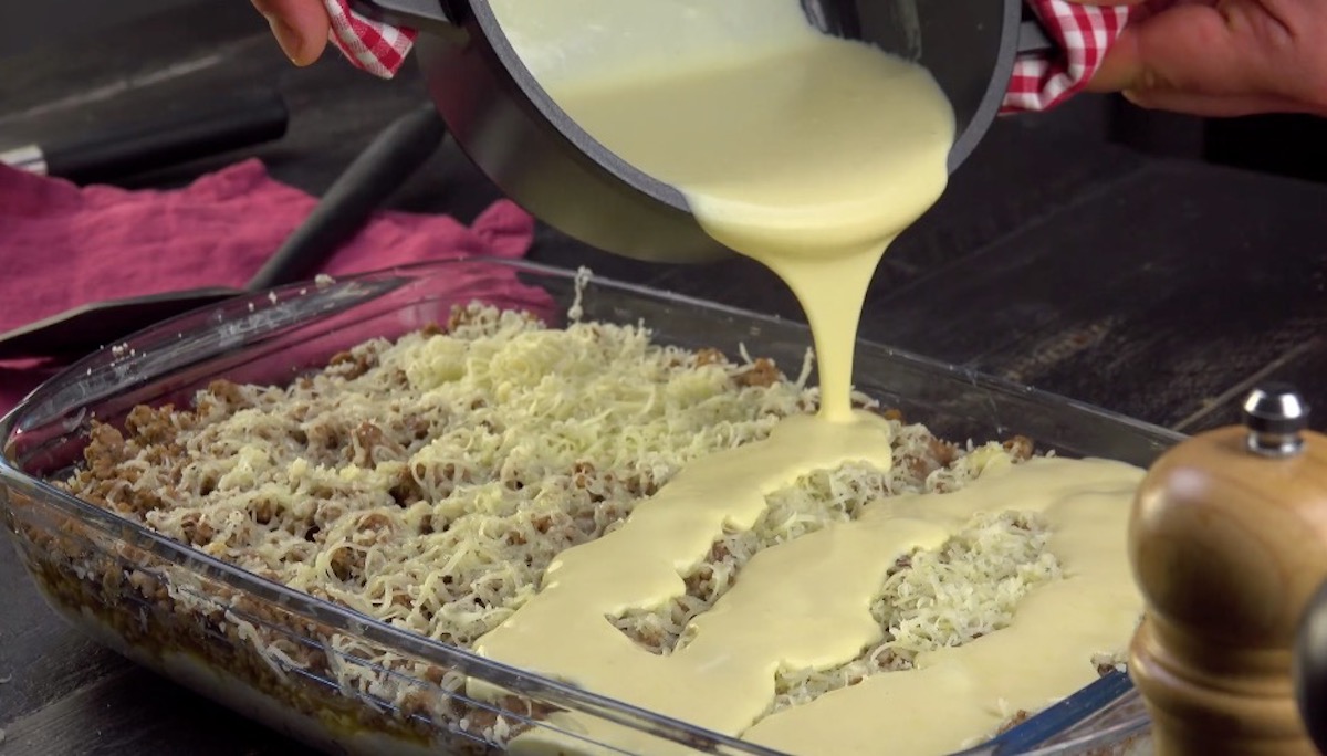 6.) Jetzt kannst du alles in die Auflaufform schichten. Gib auf die Blumenkohl-Käse-Schicht zuerst das Hackfleisch, dann wieder eine Ladung geriebenen Käse. Gieße dann die Béchamelsauce darauf und verteile sie mit einem Löffel gleichmäßig auf der Fleisch-Käse-Schicht.