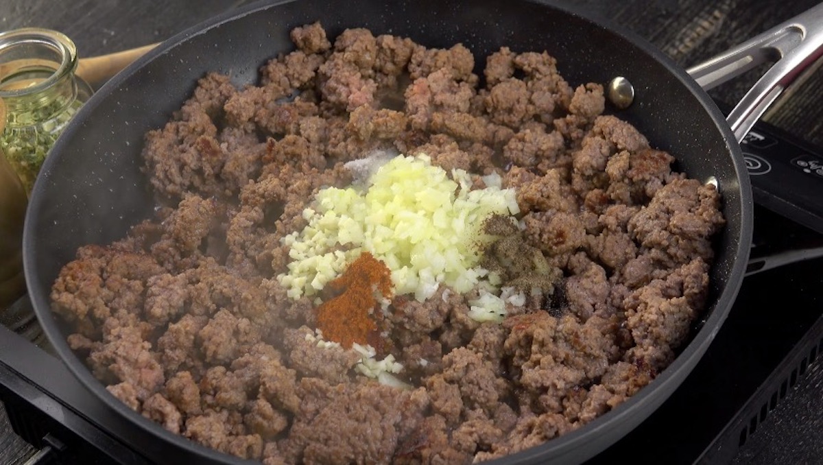 4.) Brate nun das Hackfleisch in etwas Öl scharf an und füge die gehackten Zwiebeln, den gehackten Knoblauch und die Gewürze hinzu.