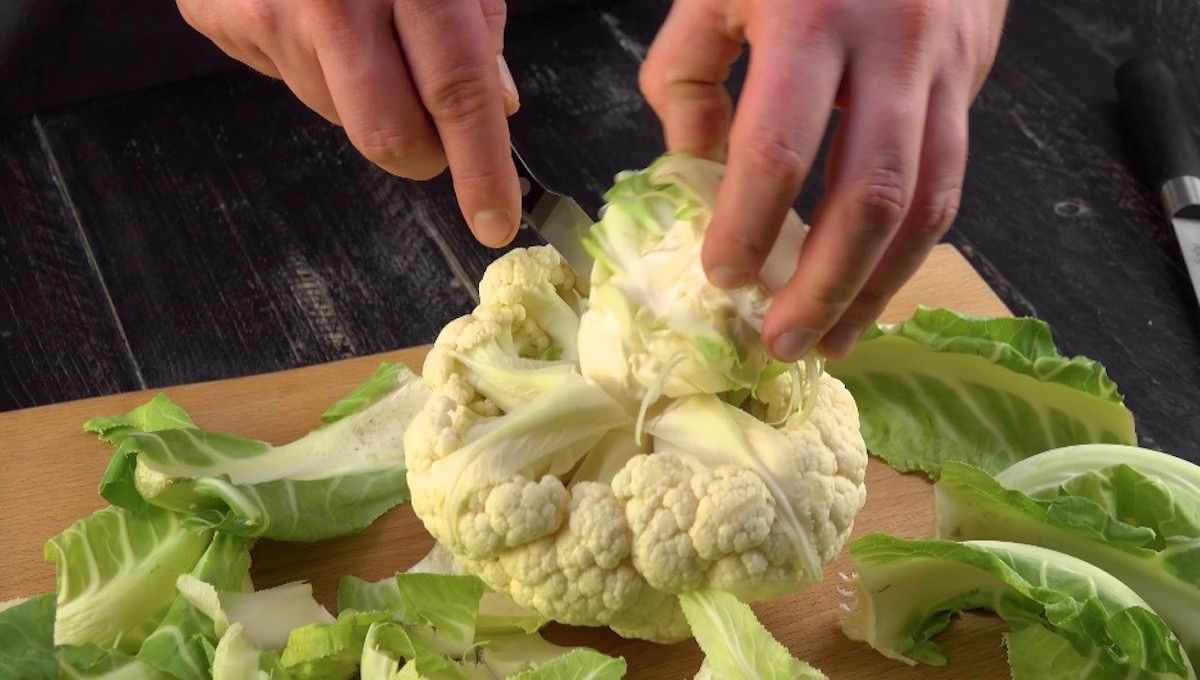 1.) Befreie als Erstes den Blumenkohl von seinen äußeren Blättern. Schneide den Strunk heraus und koche den Blumenkohl in Salzwasser, bis er gar ist.