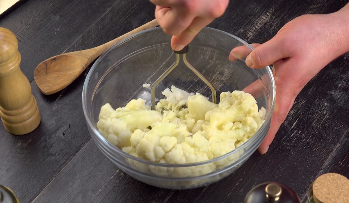 2.) Gib den Blumenkohl anschließend in eine Schüssel und zerstampfe ihn mit einem Kartoffelstampfer. Es können aber ruhig noch ein paar kleine Stückchen übrig bleiben.