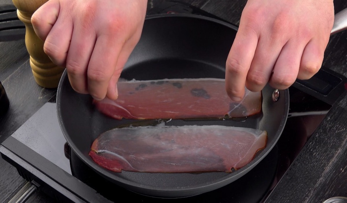 Brate die acht Scheiben Schinken in etwas Öl in der Pfanne an, nimm sie dann heraus und lasse sie kurz abkühlen.