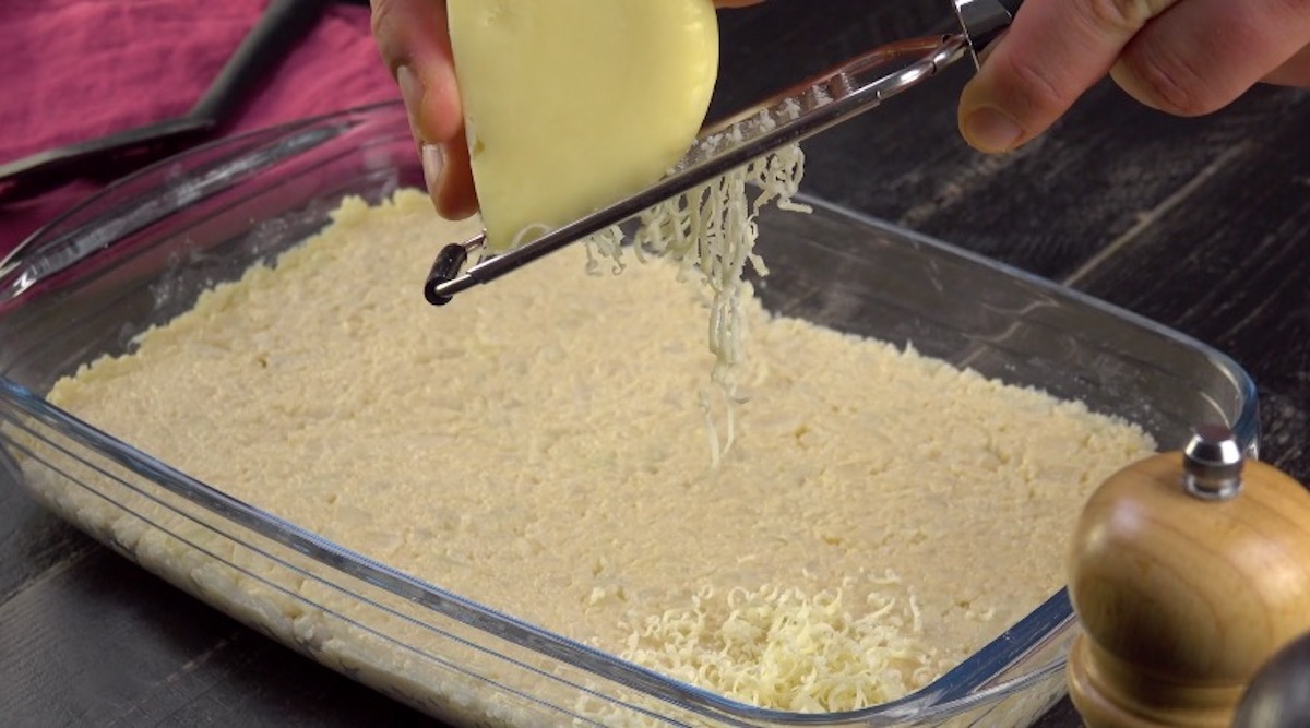 3.) Gib das Ei und das Mehl zu dem Blumenkohl-Brei. Würze die Masse mit Salz, Pfeffer und Muskatnuss. Vermenge alles und gib den Brei dann in eine Auflaufform. Drücke ihn mit einem großen Löffel platt und reibe ca. 1/3 des Käses darüber.