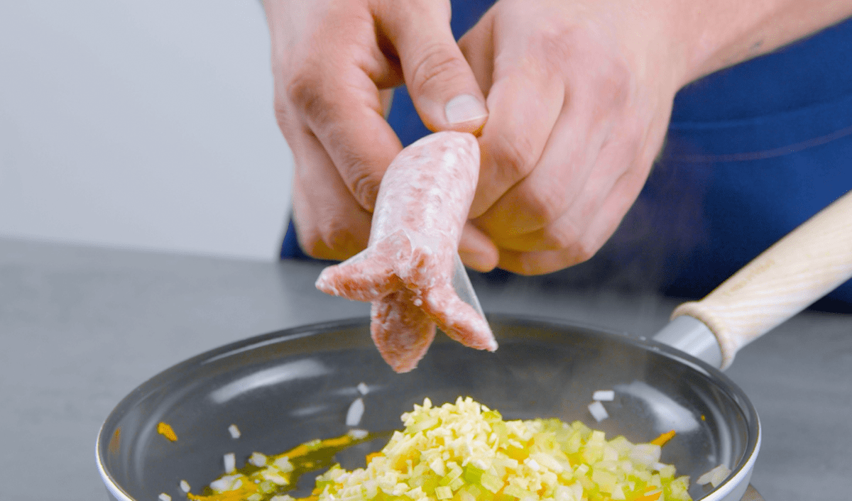 2. Brate in der Zwischenzeit Zwiebel, Knoblauch, Möhren und Hackfleisch in etwas Öl an. Füge das Brät der Bratwürste hinzu und verteile es in der Pfanne. Lösche alles mit Rotwein ab und gib danach die Pizzatomaten hinzu. Würze mit Salz und Pfeffer und verrühre alles gut miteinander. Zum Schluss kommen die gekochten Spaghetti mit in die Pfanne.
