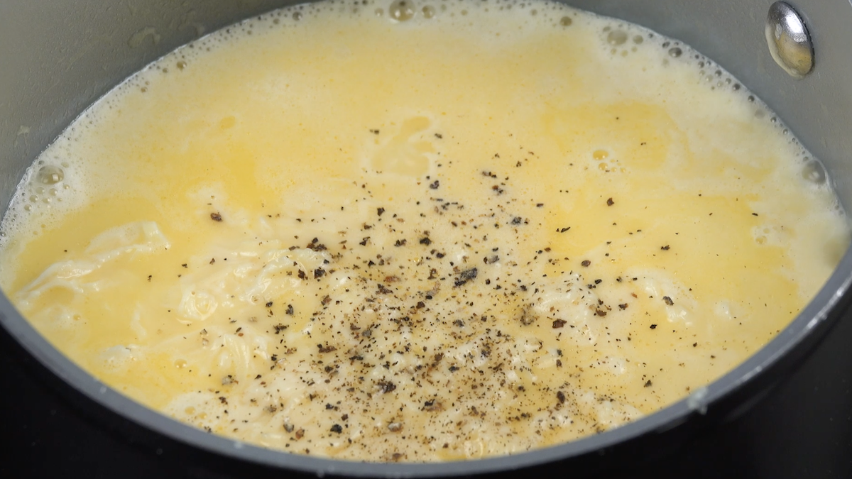 6.) Reibe Käse in einen Topf und gib Bier und Sahne hinzu. Würze alles mit Pfeffer und lasse die Masse aufkochen. Falls die gewünschte cremige Konsistenz nicht entsteht, kannst du angerührte Stärke hinzugeben.