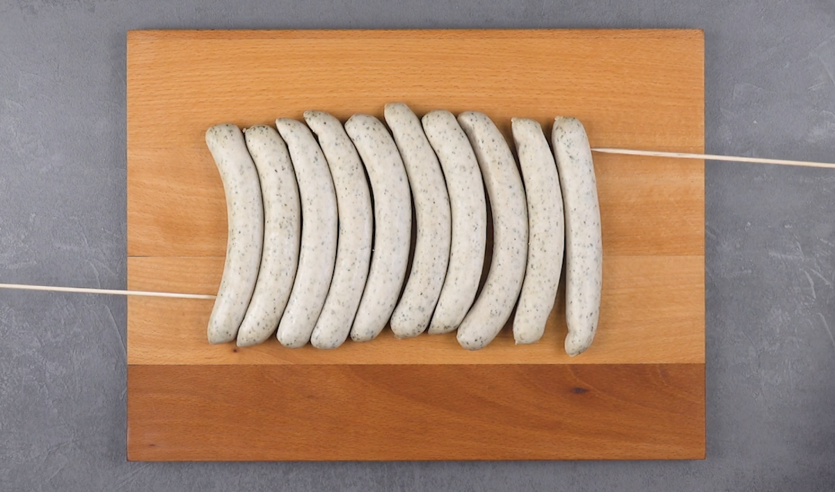1.) Lege die Bratwürste nebeneinander auf ein Brett und stecke zwei Holzspieße von oben und von unten seitlich durch alle Würste hindurch.