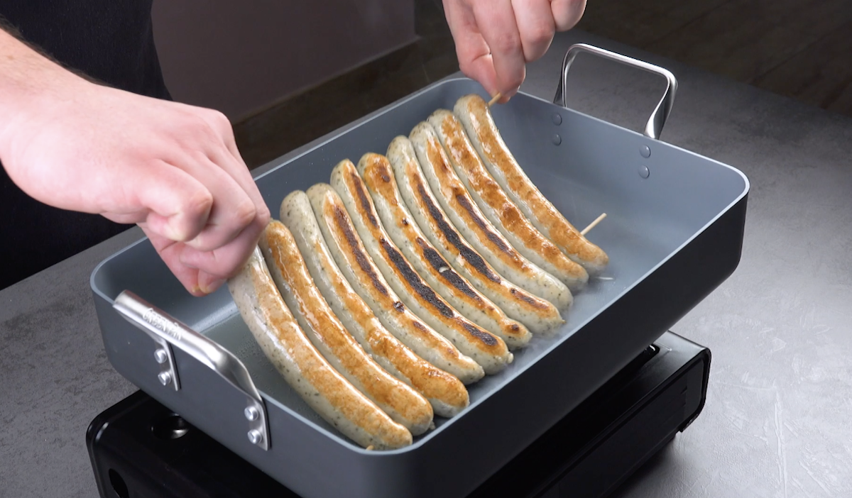 2.) Lege die aufgespießten Würste in eine große Pfanne oder in eine große Auflaufform und brate sie von beiden Seiten an.