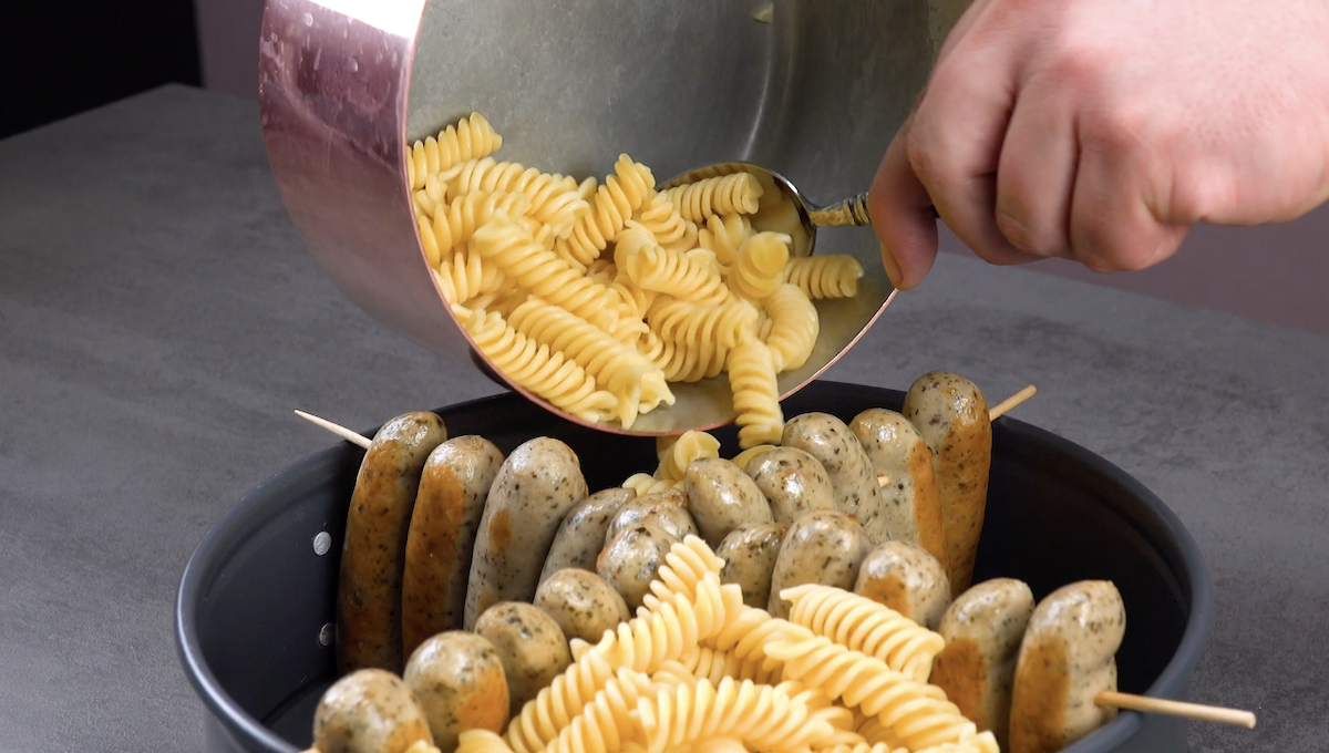 5.) Koche die Spirelli-Nudeln und gib sie dann in zwei von vier Wurst-Kammern der Springform.