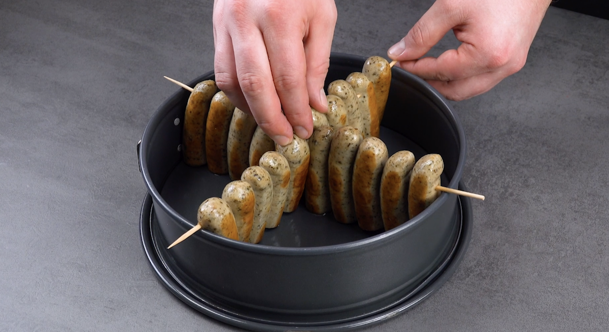 4.) Stelle die beiden Wurstspieße über Kreuz in eine Springform.