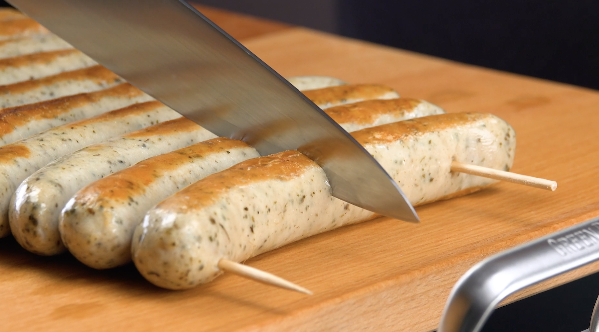 3.) Nimm die Würste aus der Pfanne und schneide sie in der Mitte einmal durch. Wichtig ist, dass die Wursthälften trotzdem noch auf den Spießen bleiben.