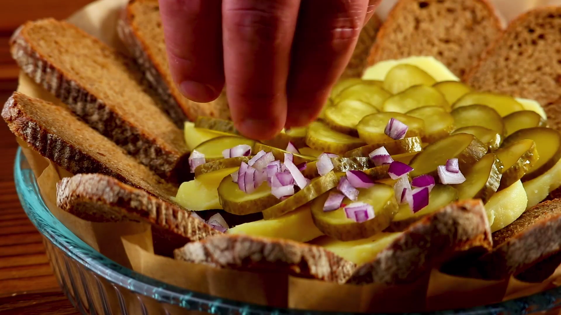 Darauf folgt eine Schicht aus Gewürzgurken, dann kommen die Zwiebelwürfel an die Reihe.