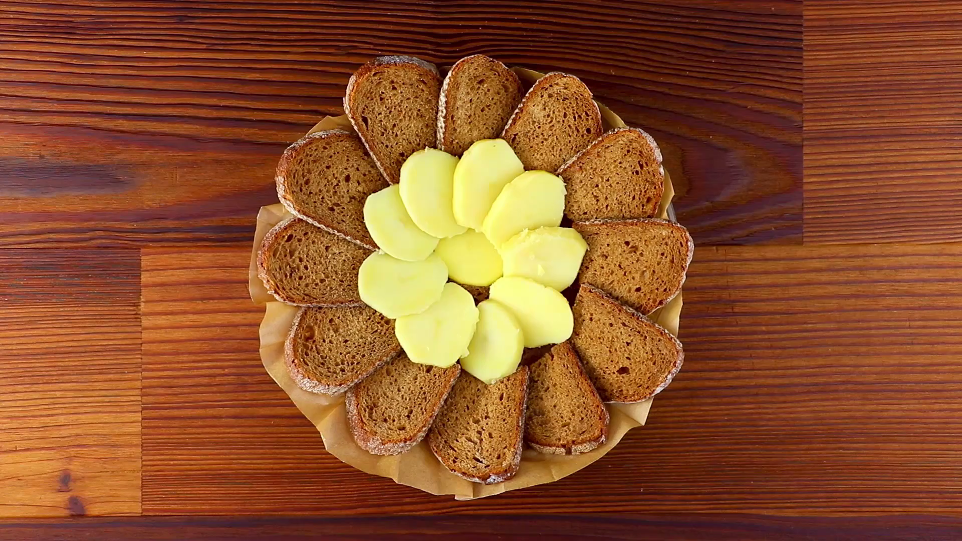 Nun legst du erst den Boden der Form mit einer Schicht Brotscheiben aus, dann den Rand mit halben Scheiben. Belege den Boden der Tarte nun mit Kartoffelscheiben.