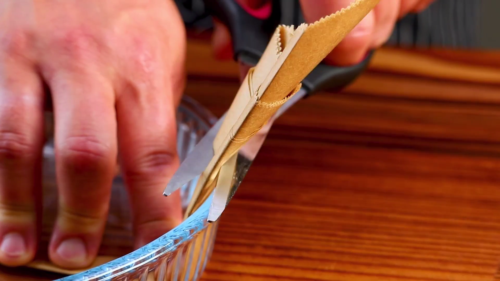 Falte ein Stück Backpapier zu einem Trichter, lege dessen Spitze auf den Mittelpunkt einer Quicheform und schneide das überstehende Backpapier ab. Faltest du nun das Backpapier auseinander, hast du ein perfekt passendes Stück für die Form.