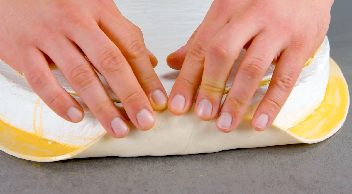 6. Platziere den Brie dann mittig auf einem der Blätterteige. Bestreiche den Teig mit verquirltem Ei und klappe ihn dann an den Seiten des Bries nach oben.