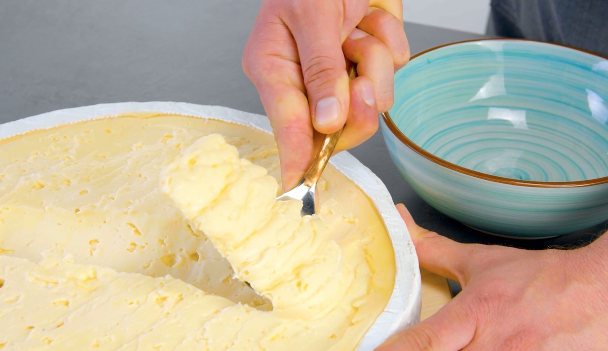 3. Höhle den Brie nun aus, hebe den Käse jedoch auf.