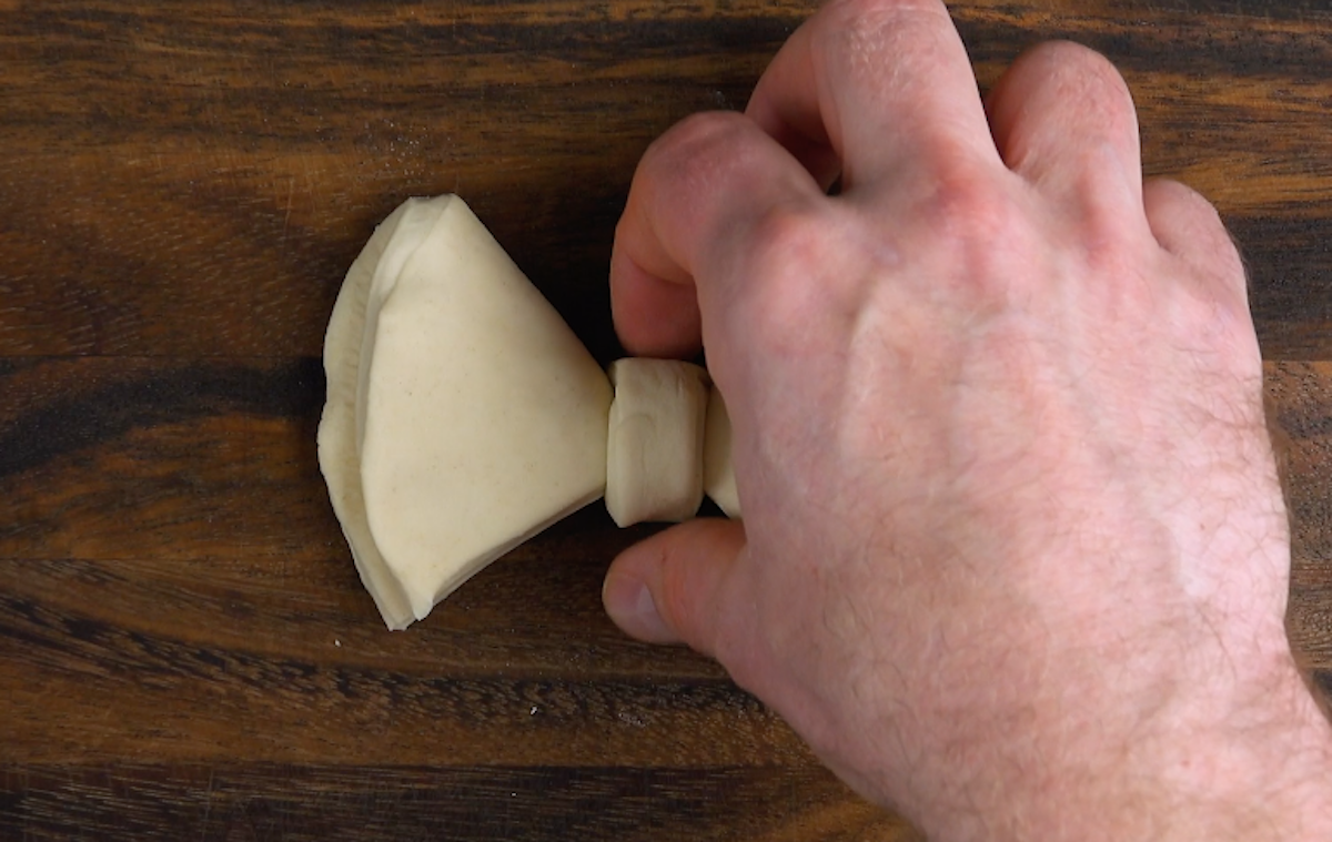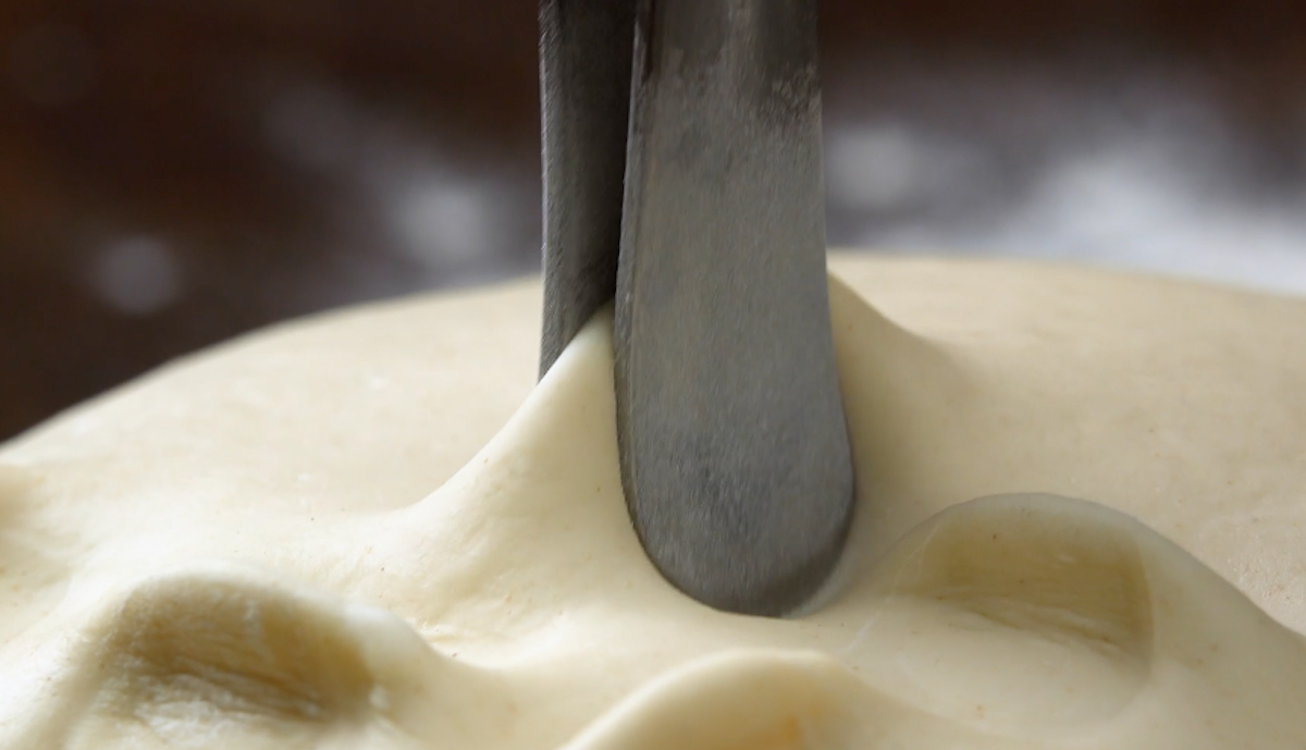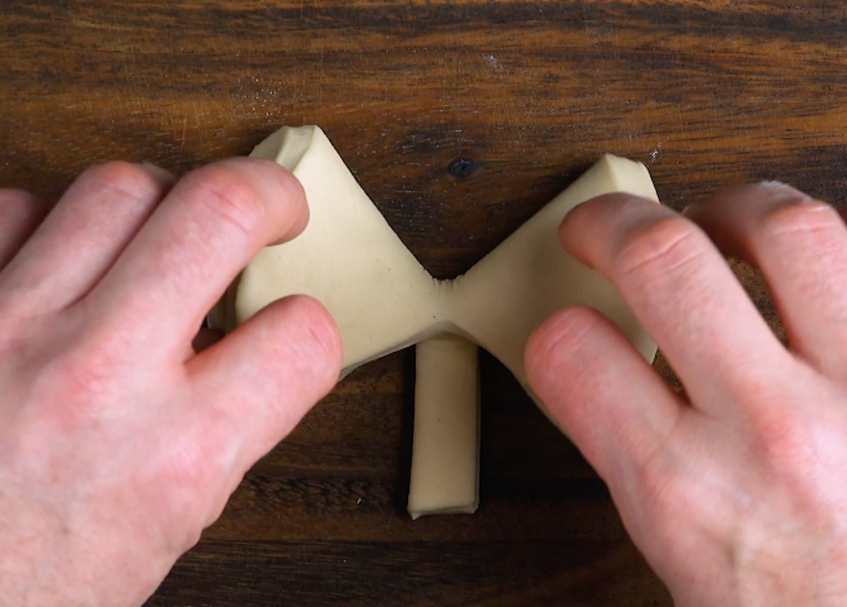 1.2) Ziehe dann den Teig mithilfe der Gabel-Konstruktion an mehreren Stellen nach oben, sodass ein gleichmäßiges Muster entsteht.