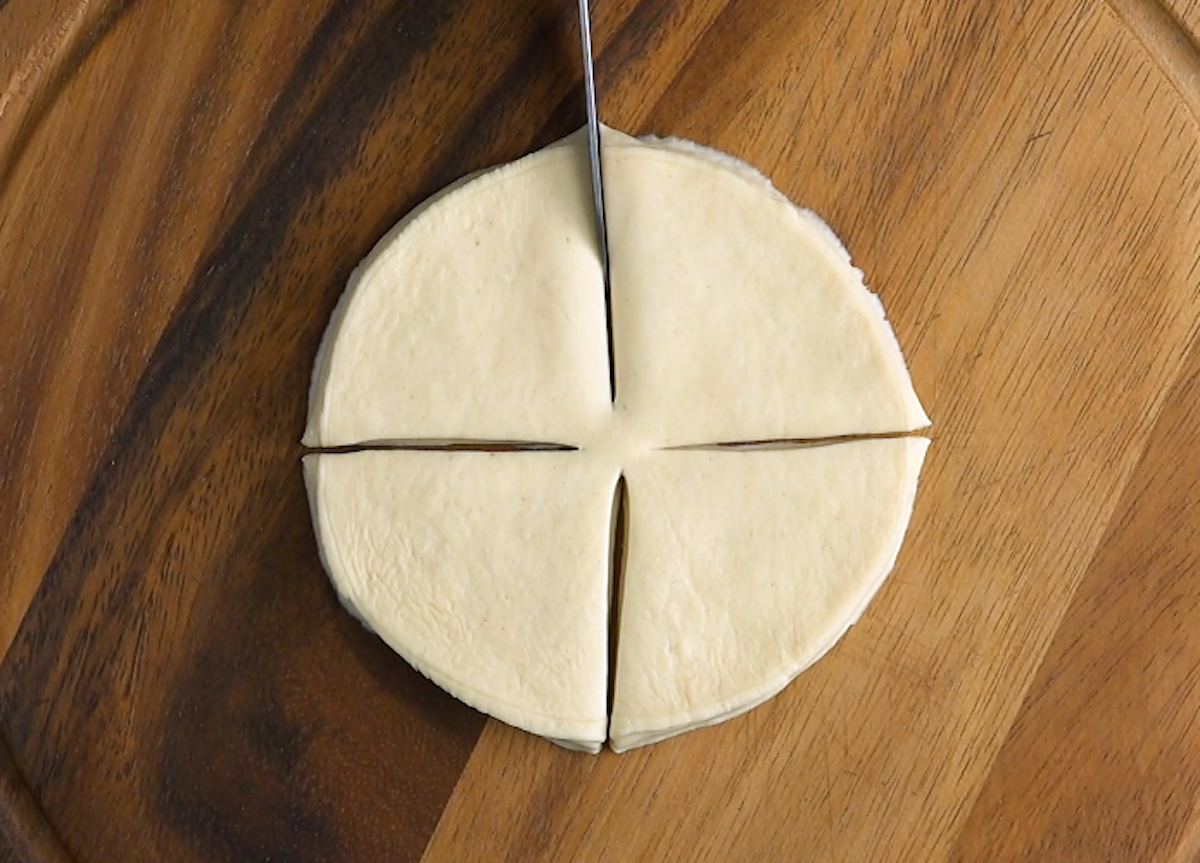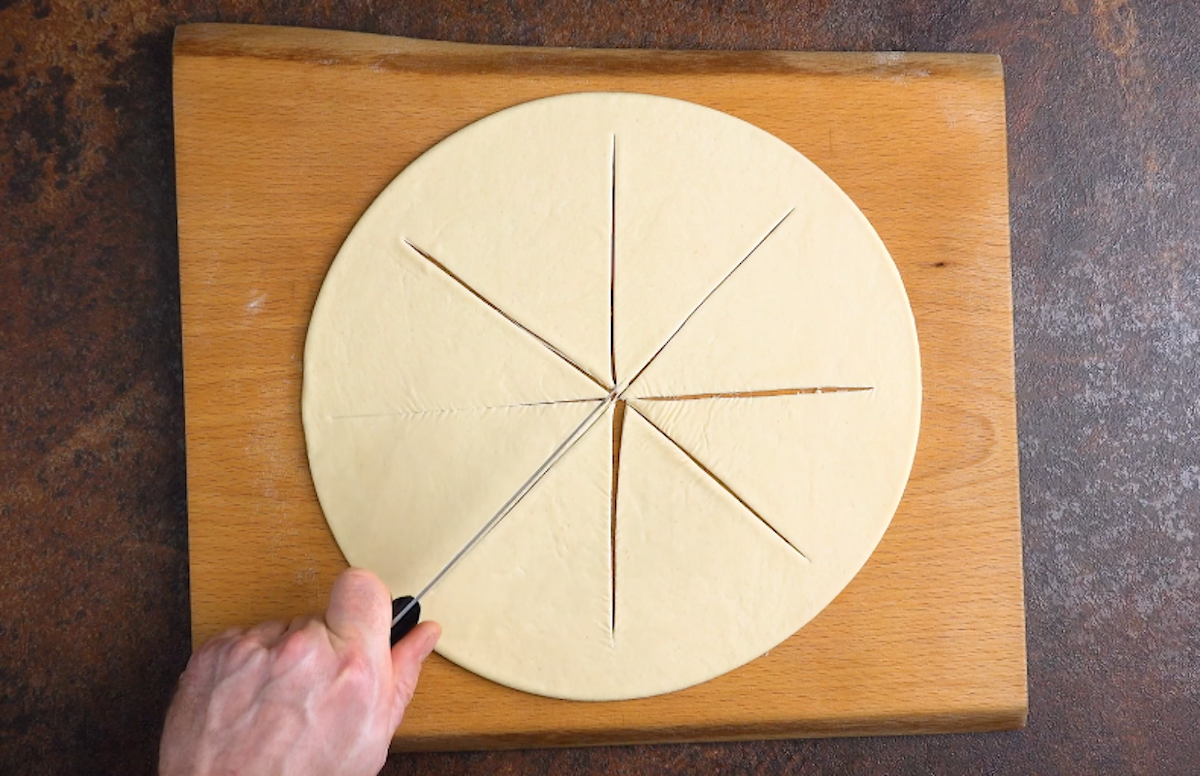 10.1) Stich aus dem ausgerollten Teig einen Kreis von ca. 13 cm Durchmesser aus. Schneide den Kreis so ein, dass 4 gleich große Segmente zu sehen sind.