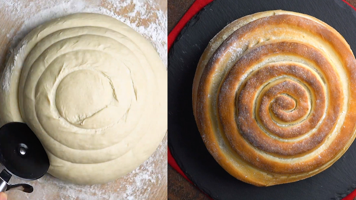 Forme den Teig zu einer Kugel und schneide sie mit einem Pizzaschneider oder mit einem kleinen Messer spiralförmig ein. Am besten nimmst du dafür einen Drehteller zu Hilfe. Schiebe das Brot bei 250 °C in den vorgeheizten Backofen und backe es für 15 Minuten an. Drehe die Gradzahl dann auf 180 °C herunter und backe das Brot weitere 30 Minuten. Mache am Ende den Klopftest – das Brot sollte hohl klingen.