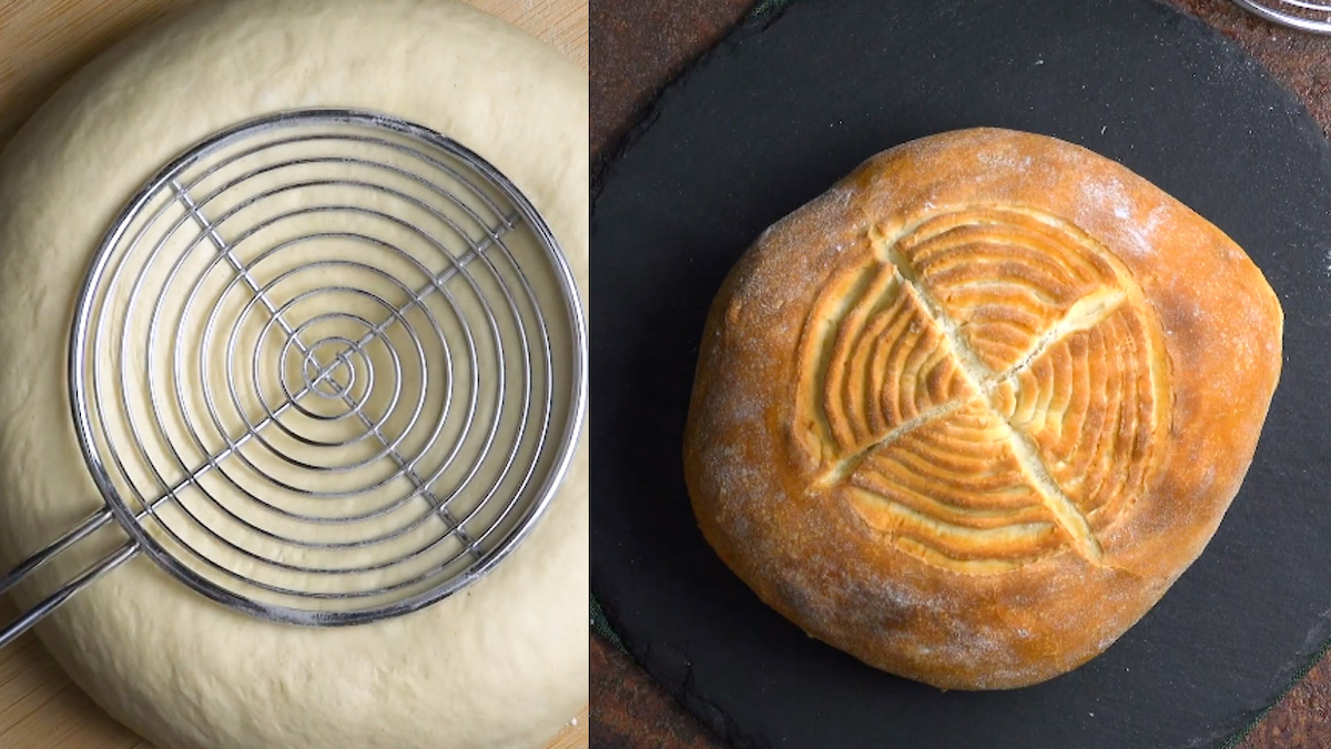 Forme den Teig zu einer Kugel. Bestäube eine Siebkelle mit Mehl und drücke sie mittig in den Teig. Schiebe das Brot in den vorgeheizten Backofen und backe es bei 250 °C Ober- und Unterhitze 15 Minuten an. Reduziere die Temperatur nach 15 Minuten auf 180 °C und backe es erneut für 30 Minuten. Mache am Ende den Klopftest – das Brot sollte hohl klingen.