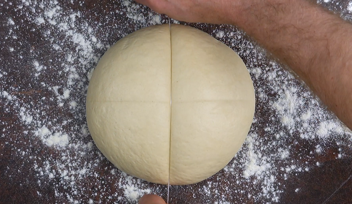 2.1) Forme den Teig zu einer Kugel und „viertele“ ihn mit Zahnseide. Drücke aber nur leicht in den Teig, sodass du nur die Linien siehst.