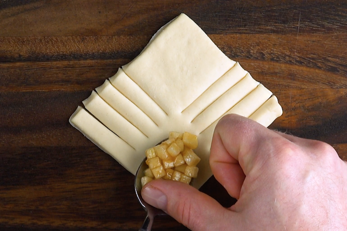 7.2) Mische Apfelwürfel mit Zimt und Apfelmus. Lege dann 1 EL Apfelwürfel auf die untere Hälfte des Quadrats.